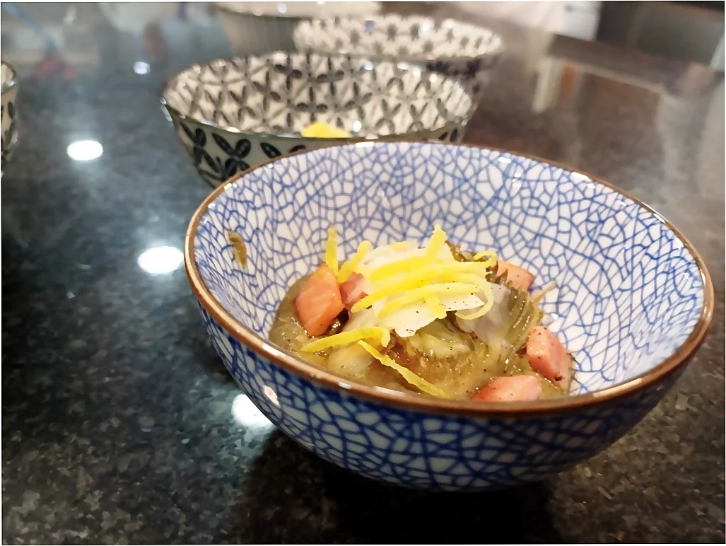 Cortar en cuartos las otras alcachofas y confitar en manteca de cerdo unos 10 minutos.