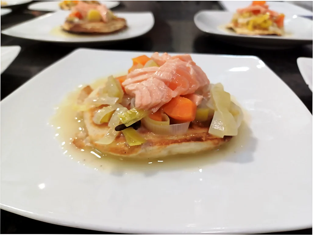 Colamos el caldo y reservamos las verduras para colocar sobre el salmón.